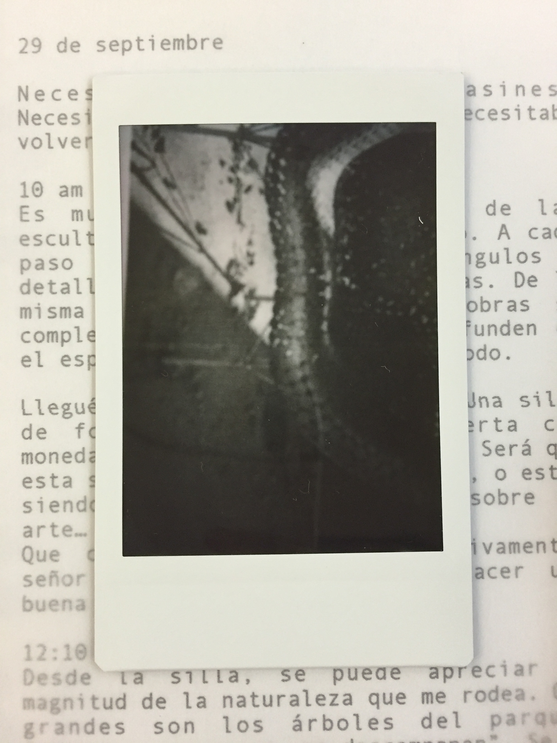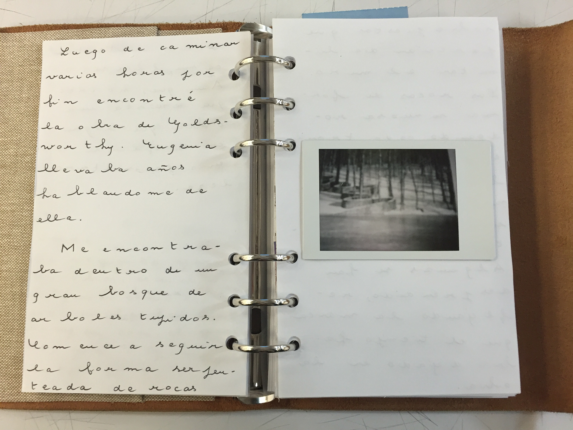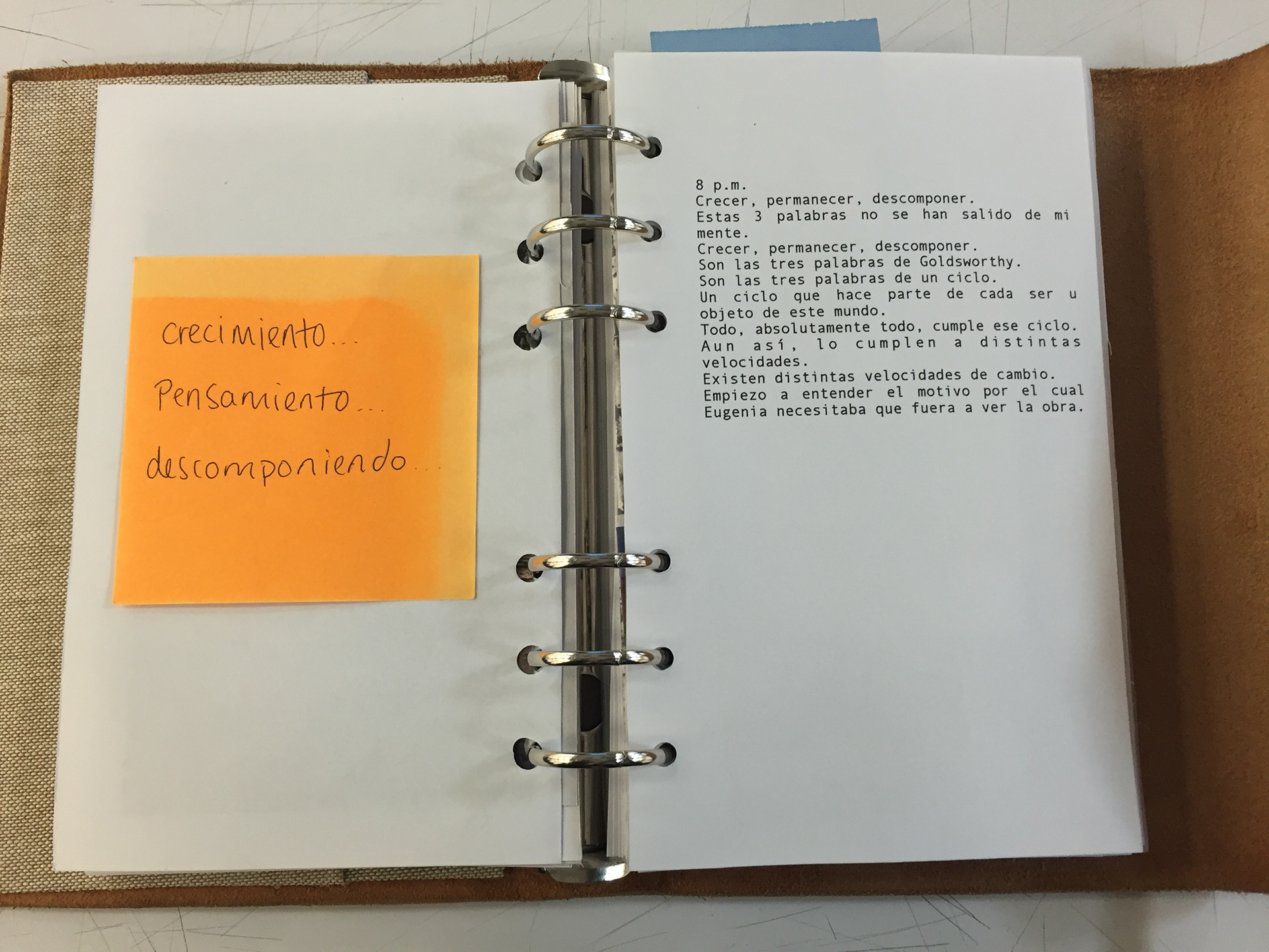 Bitacora. "8 p.m. Crecer, permanecer, descomponer. Estas 3 palabras no se han salido de mi mente. Crecer, permanecer, descomponer. Son las tres palabras de Goldsworthy. Son las tres palabras de un ciclo. Un ciclo que hace parte de cada ser u objeto de este mundo. Todo, absolutamente todo, cumple ese ciclo. Aun así, lo cumplen a distintas velocidades. Existen distintas velocidades de cambio. Empiezo a entender el motivo por el cual Eugenia necesitaba que fuera a ver la obra. "